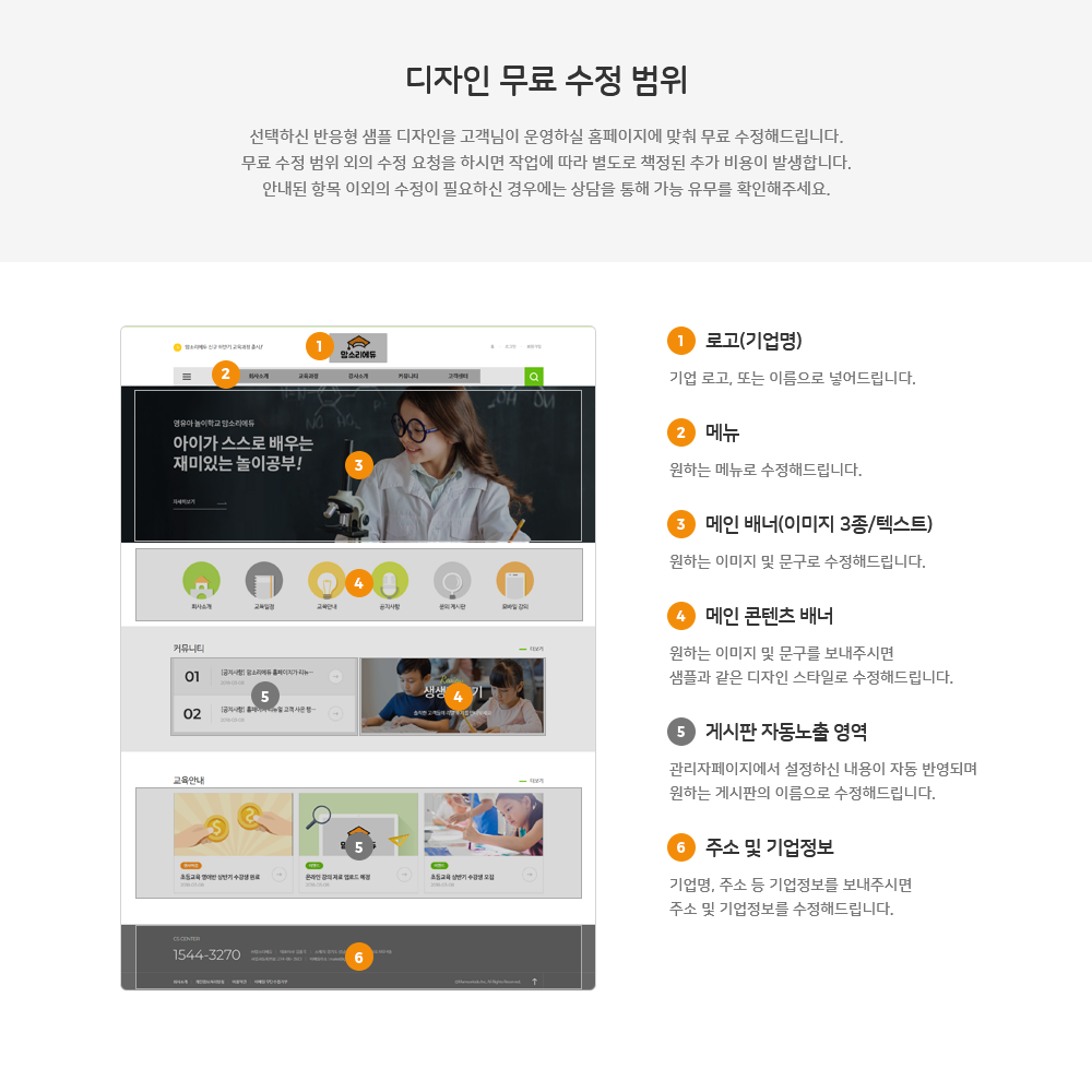 - 메인페이지 1P / 디자인 페이지 7P / 게시판 최대 10P / 회원가입/ 팝업관리 / SEO 검색 최적화