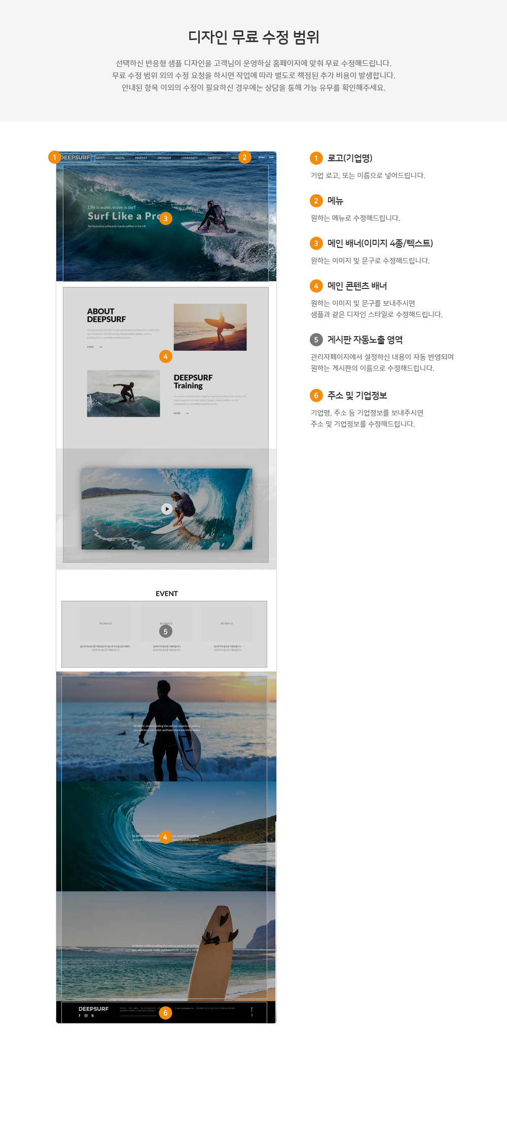 - 메인페이지 1P / 디자인 페이지 7P / 게시판 최대 10P / 회원가입/ 팝업관리 / SEO 검색 최적화