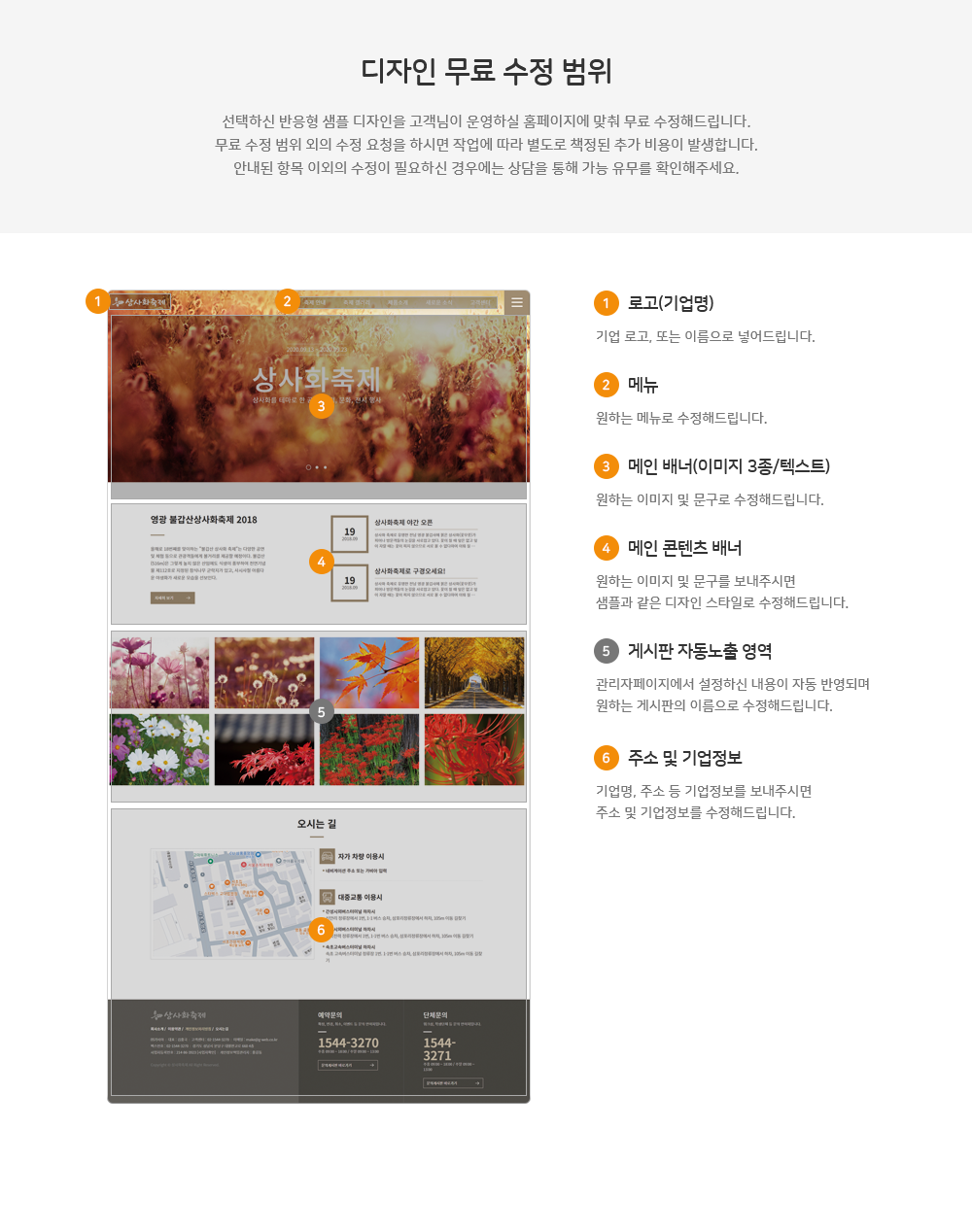 - 메인페이지 1P / 디자인 페이지 7P / 게시판 최대 10P / 회원가입/ 팝업관리 / SEO 검색 최적화