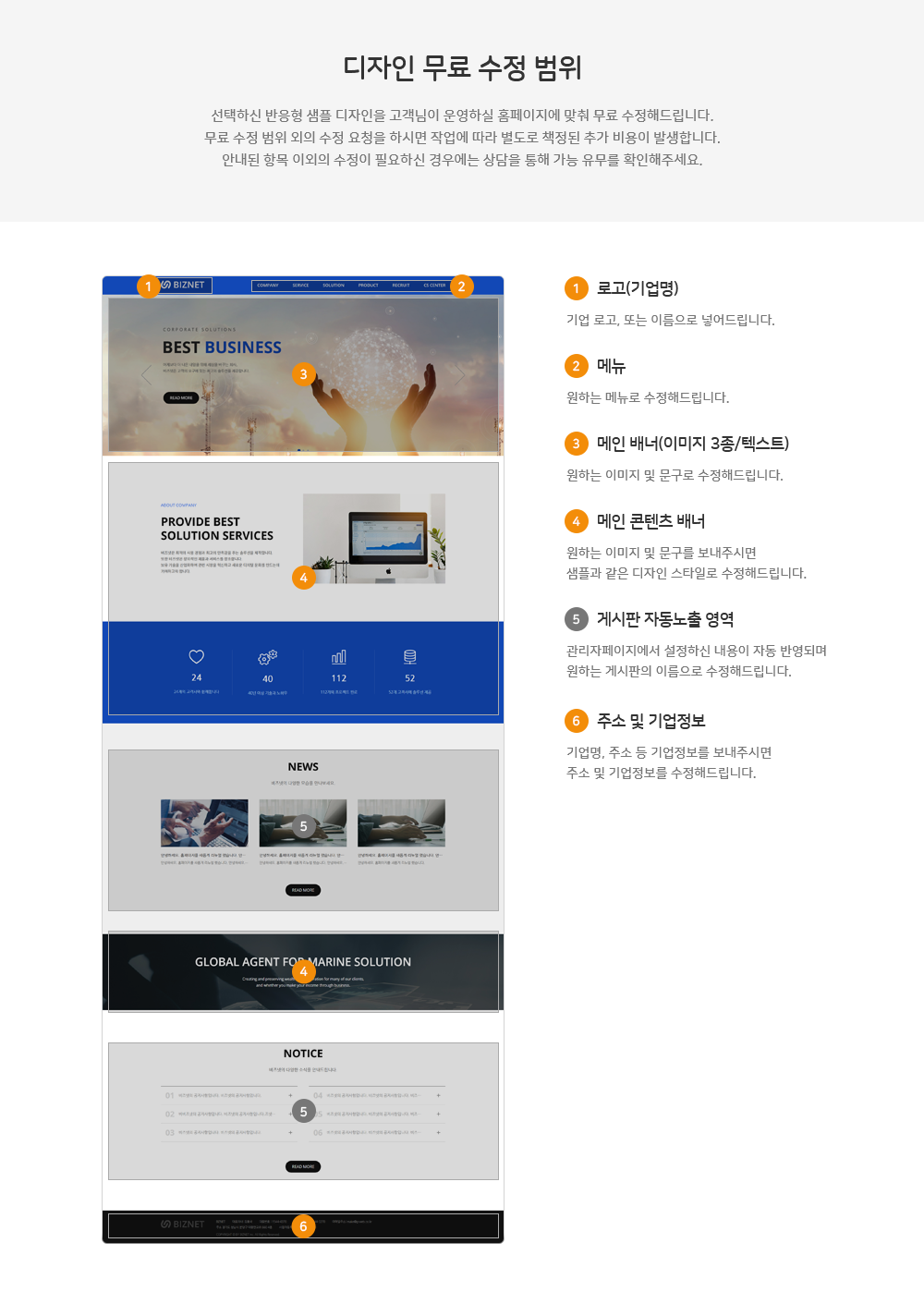 - 메인페이지 1P / 디자인 페이지 7P / 게시판 최대 10P / 회원가입/ 팝업관리 / SEO 검색 최적화