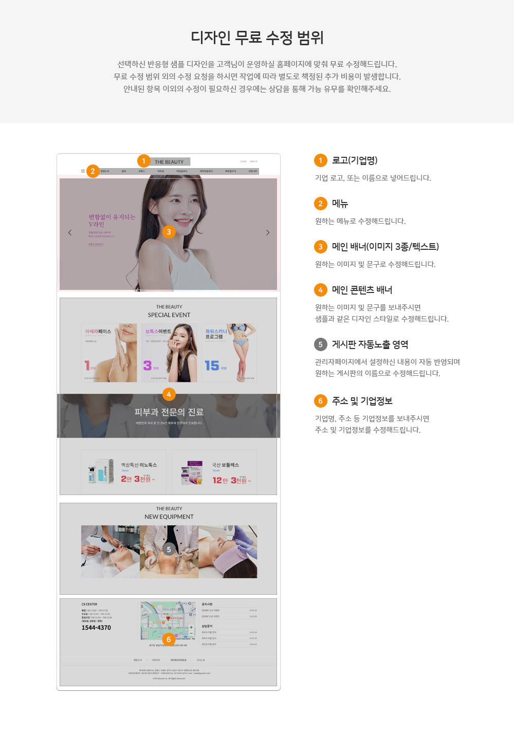 - 메인페이지 1P / 디자인 페이지 7P / 게시판 최대 10P / 회원가입/ 팝업관리 / SEO 검색 최적화