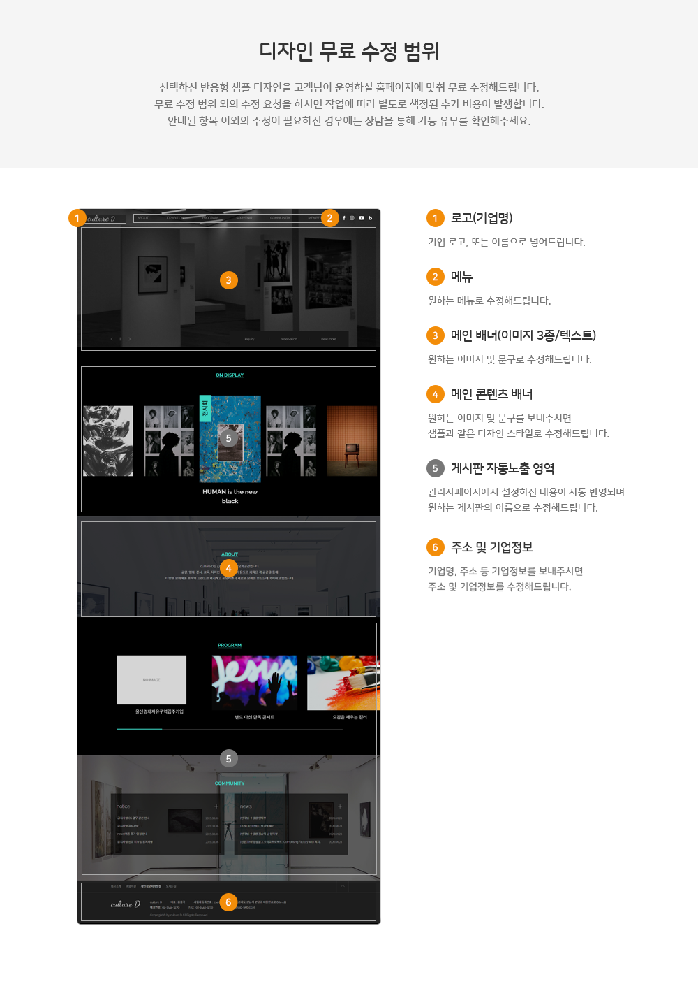 - 메인페이지 1P / 디자인 페이지 7P / 게시판 최대 10P / 회원가입/ 팝업관리 / SEO 검색 최적화